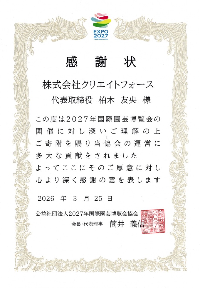 グループ会社の株式会社クリエイトフォースは、公益社団法人2027年国際園芸博覧会協会(EXPO 2027 YOKOHAMA JAPAN)の開催趣旨に深く賛同し、運営支援のためご寄付をいたしました。